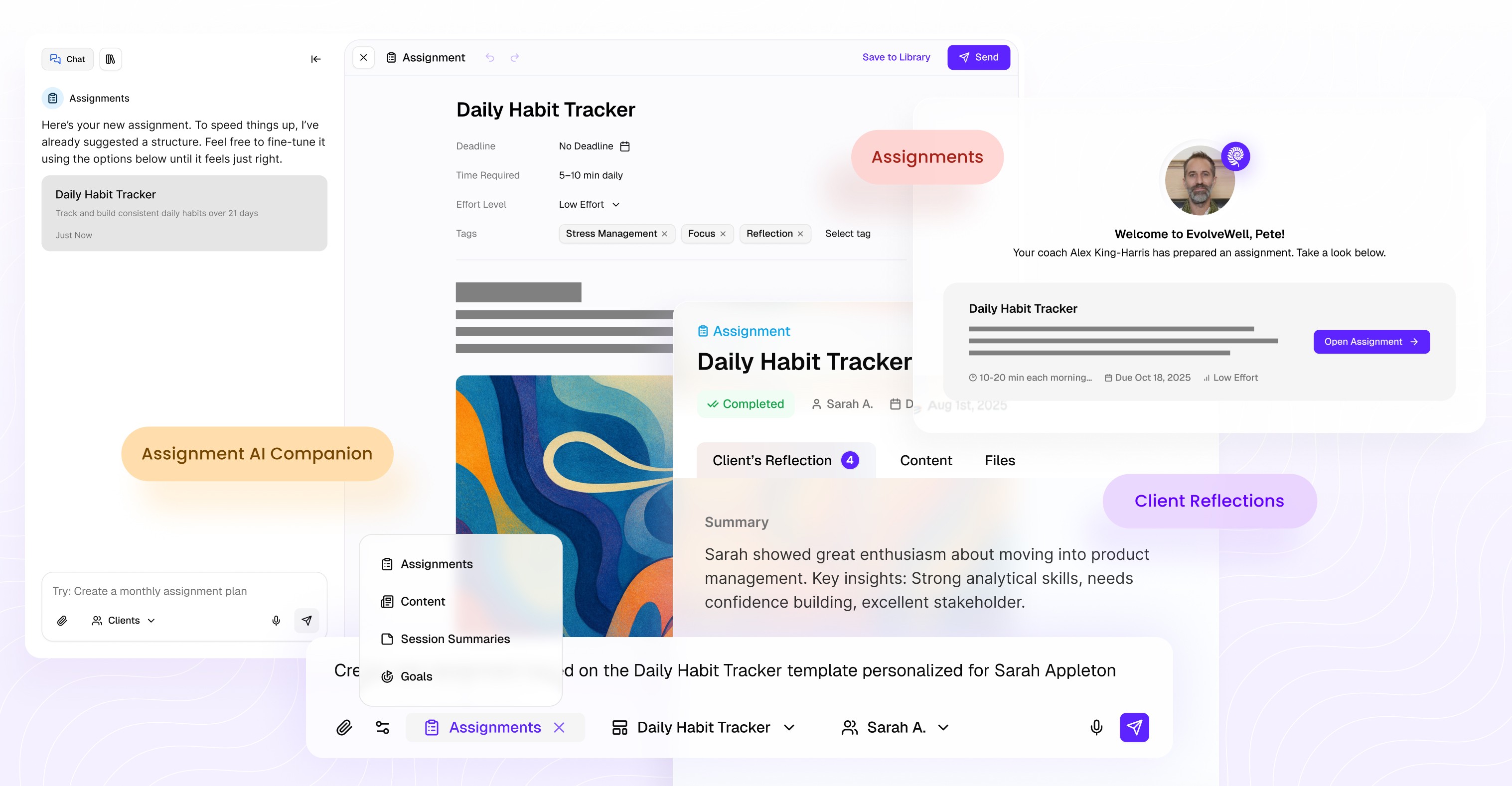 Automatically generates personalized assignments tailored to your coaching style, helping clients apply your approach.