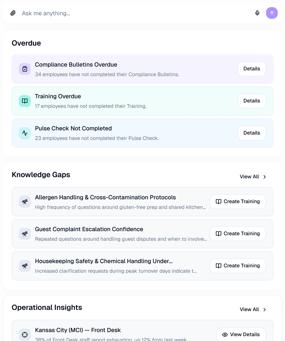 Daily Pulse Checks track workforce sentiment in real time. You see readiness scores, morale trends, and early attrition signals by team, shift, or property. Not in a quarterly survey.